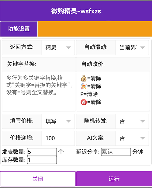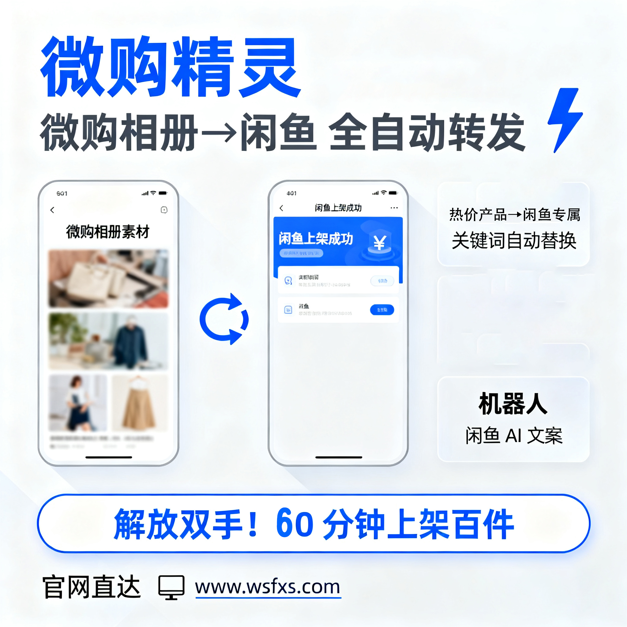 做微商、电商的你,是否每天被一件事消耗大量时间:从微购相册(原微商相册)挑选爆款素材,手动修改文案关键词、调整价格,再逐字逐句编写闲鱼标题,最后设置库存、上传图片…… 一套流程下来,半天时间没了,却只上架了寥寥几件商品。更头疼的是,同款商品价格混乱、关键词不对导致曝光低迷,手动改价时算错金额还会亏单!现在,这些难题都能被「微购精灵」轻松解决 —— 全自动分享转发微购相册素材到闲鱼,让运营效率翻倍,爆单概率直线上升!