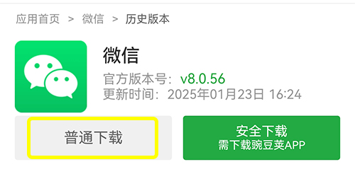 8.0.56及以下版本微信:https://www.wandoujia.com/apps/596157/history_v2800 ,选择普通下载就可以了。部分手机如下图提示应用市场推荐安装包,我们选择网页安装包下载.